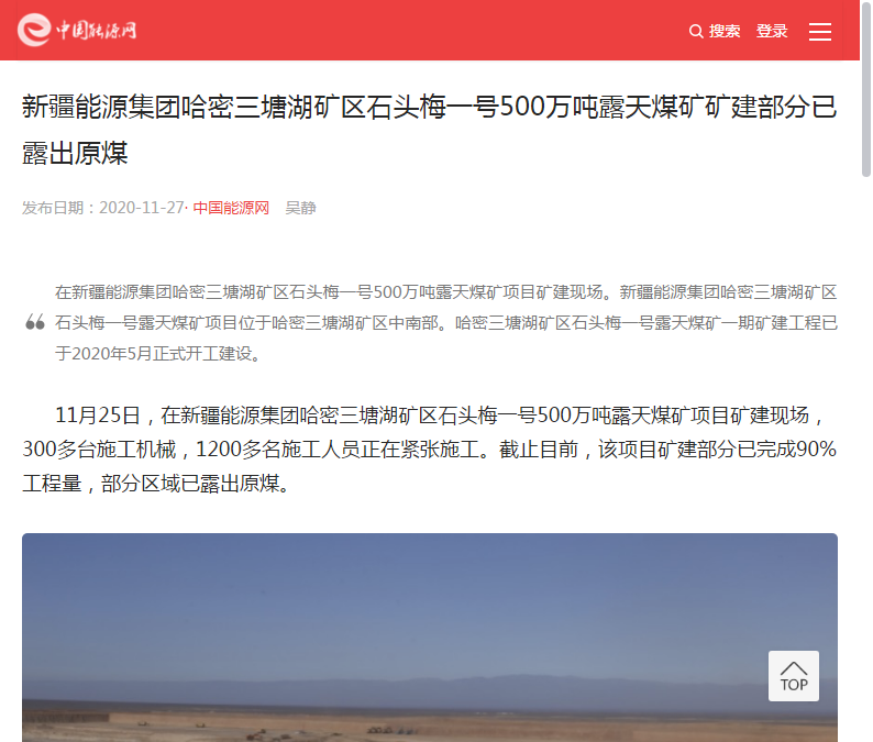【中國(guó)能源網(wǎng)】新疆能源集團(tuán)哈密三塘湖礦區(qū)石頭梅一號(hào)500萬(wàn)噸露天煤礦礦建部分已露出原煤