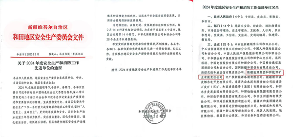 近日,和田礦業(yè)公司被和田地區(qū)安全生產(chǎn)委員會評為“2024年度和田地區(qū)安全生產(chǎn)和消防工作先進(jìn)單位”。