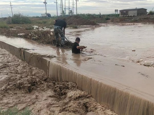 汛情就是命令,農(nóng)場全體職工始終堅守在抗洪一線,昌吉農(nóng)場場長徐成祥,眼看水流越來越大,淤堵越來越多,嚴(yán)重威脅農(nóng)田渡槽安全,渡槽一旦垮塌,通過渡槽引水灌溉的8000余畝土地,今秋明春的供水就會被阻斷,關(guān)鍵時刻,徐成祥同志跳入深至胸口的洪水中,爭分奪秒地打撈、清理被洪水沖下來的雜物。在徐成祥同志的帶領(lǐng)下,昌吉農(nóng)場更多的同志跳入水中加入搶險隊伍,經(jīng)過近三個小時的努力,險情終于得到了控制,保障了蓄水池及機(jī)房的安全,避免了數(shù)十萬元的經(jīng)濟(jì)損失。