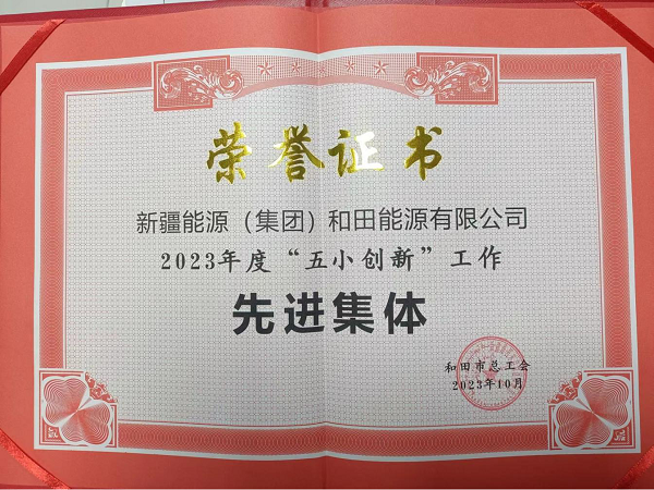 近日,和田能源公司榮獲和田市總工會2023年度“五小創(chuàng)新”工作先進集體稱號。