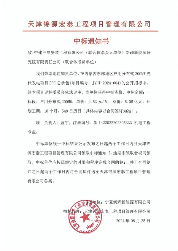 新疆新能源研究院作為聯(lián)合體成員中標(biāo)內(nèi)蒙古分布式200兆瓦光伏EPC總承包項(xiàng)目